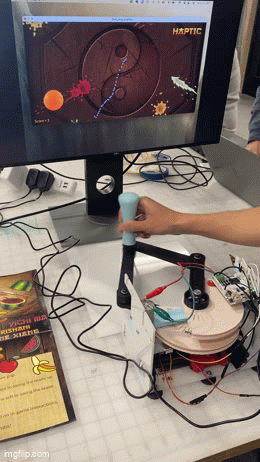 The pantograph simplifies to a 4-bar linkage, allowing the tip (handle) to move within a 2-DOF workspace. Two MR sensors at its base track the handle's movement and send its coordinates to an Arduino, which communicates with the game programmed in Processing. Processing served as the platform for designing the user interface and graphics, offering a clear and immersive visualization of the virtual environment. In this environment, the handles position is represented as a trailing blue dot. When its coordinates intersect with a fruit's, motors at the base of the pantograph activate to provide appropriate force feedback, simulating a realistic slicing sensation. To the left is a picture of our pantograph setup, including the handle, sensors, motors, and Arduino, alongside a short clip of the system in action.